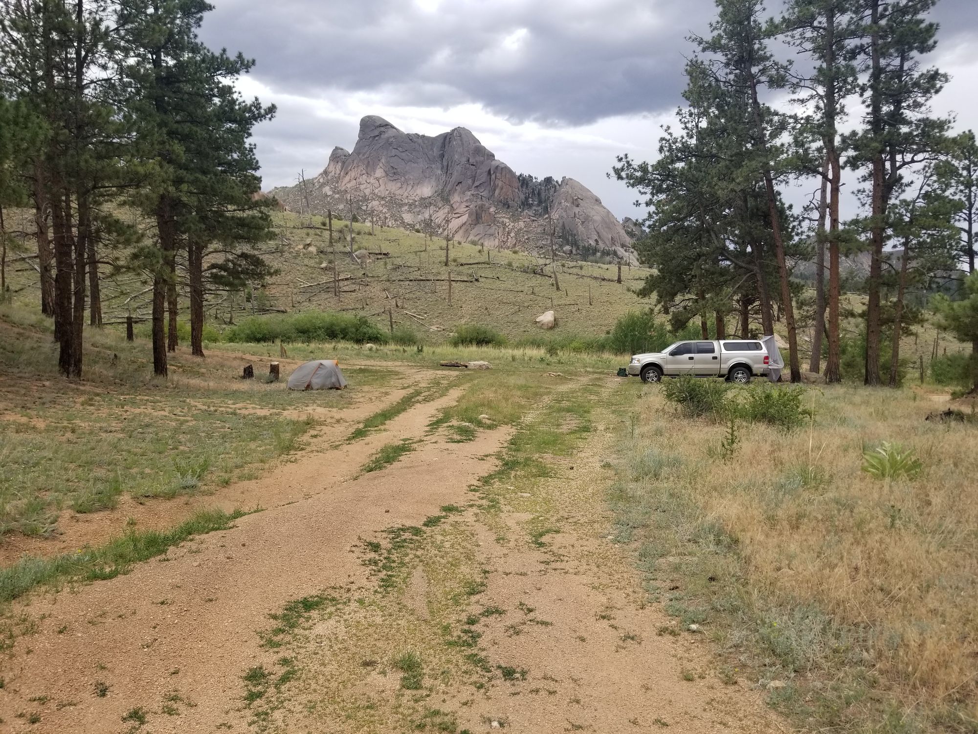 Looking for the flattest areas and the greatest likelihood of shade throughout the day, I first parked my truck, then set up my tent site. As it just so happens, their configuration might have looked like a visual challenge to anyone contemplating driving down the campsite's driveway to inquire if I'd be open to sharing my campsite...