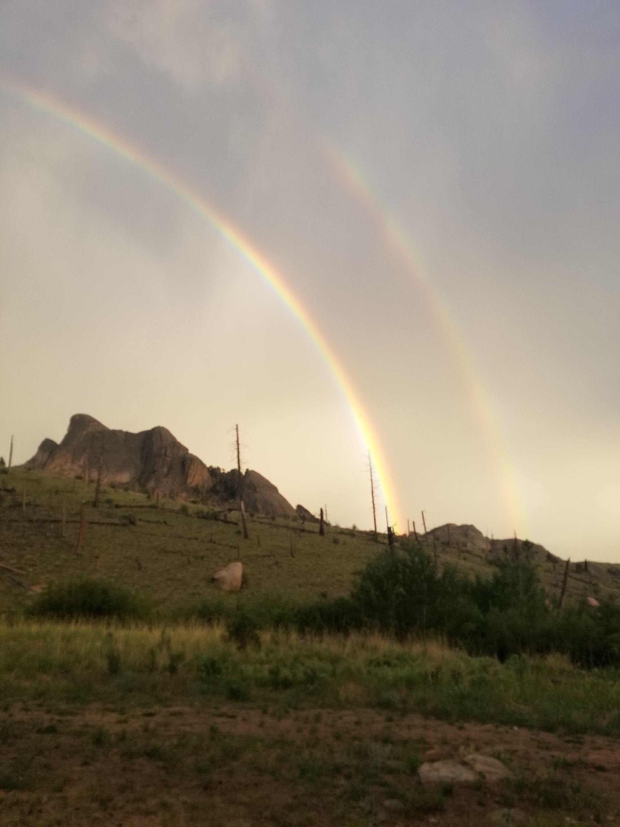As though in dialogue with my devotional practices, a massive double rainbow erupted on my last day at this site, prettily and pointedly framing my campsite and the Sheeprock peak to the southeast.