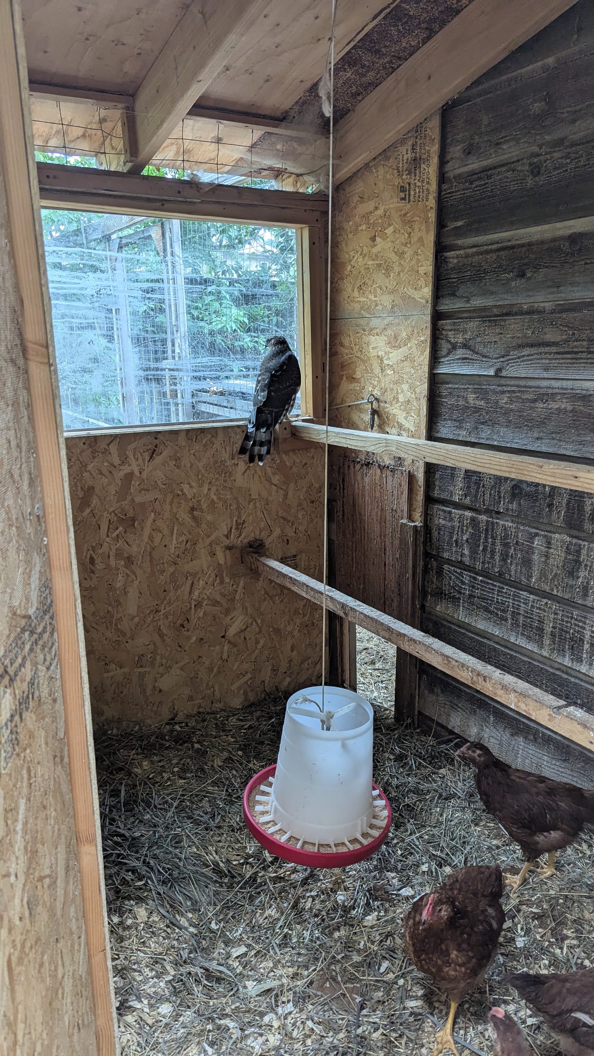 I've never seen anything like that. I've certainly never handled a bird like that. So I flung open the door to the coop, but it wouldn't fly past me and out—and I simultaneously needed to play goalie to the chicks to not escape through that same door. Many of the young chicks were huddled in the corner, kind of pressed around and against the metal watering canister, which served as a kind of barrier to the hawk. The hawk wasn't actively attacking them. I don't know how long the hawk was in the coop, but it was clearly stuck. Maybe it had been there for hours.