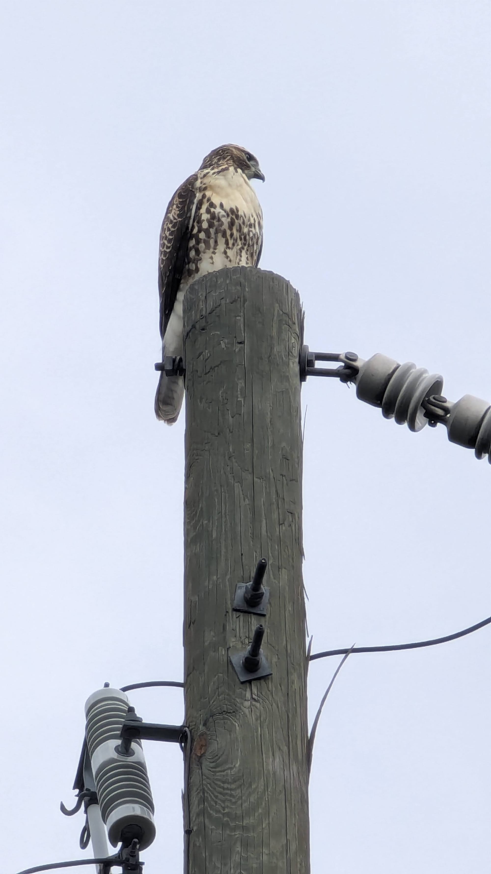 After a moment of admiration, I went back into the coop to inspect the chicks and unfortunately one was dead. I removed the dead young chicken, and threw it in the field at first, as a kind of offering to the predator bird. A few minutes later, I would bury it. Because while I was telling the story of what happened to the property owner, I noticed another bird fly and sit on an electrical post in the backyard near us. It was the same kind of bird, but even bigger. Turns out, that was a very large, mature female Cooper's hawk, perhaps the mother of the juvenile. And it was watching the chicks, which were now in an enclosed, covered outdoor cubicle. She was watching them, and she was watching us.